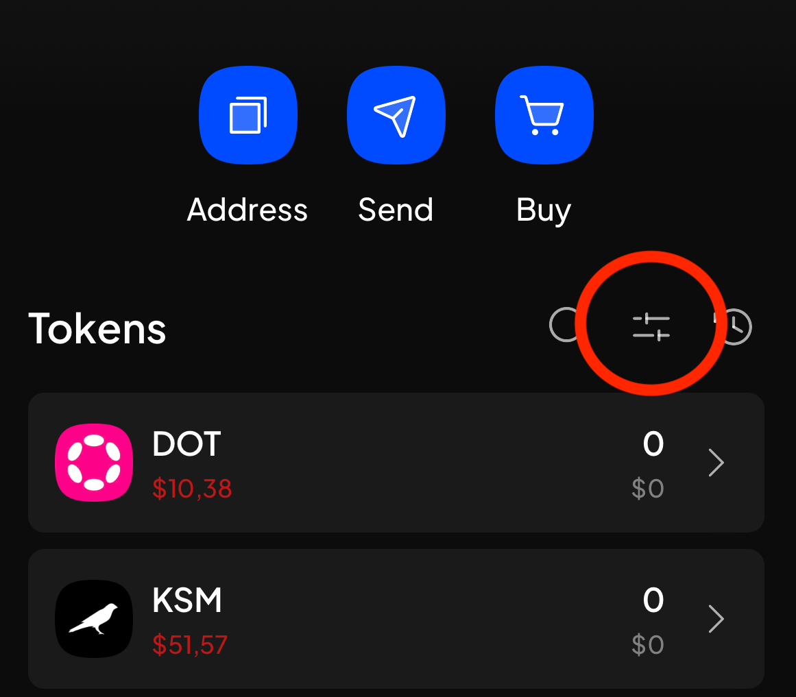 After you added the DENTNet network in SubWallet you can enable the DENT token and DENTX to show up in the main UI.